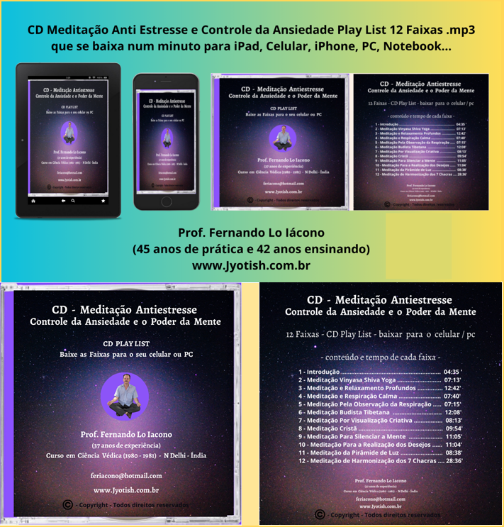 Aqui abaixo o meu CD Play List de Meditação Quântica Védica do Yoga tradicional da Índia para a redução do estresse, da ansiedade, prevenção das doenças psicossomáticas (insônia, hipertensão, gastrite, depressão, síndrome do pânico, medos, fobias, memória ruim, baixo poder de concentração, imunidade baixa, alergias, baixa auto estima ou auto confiança, etc.!