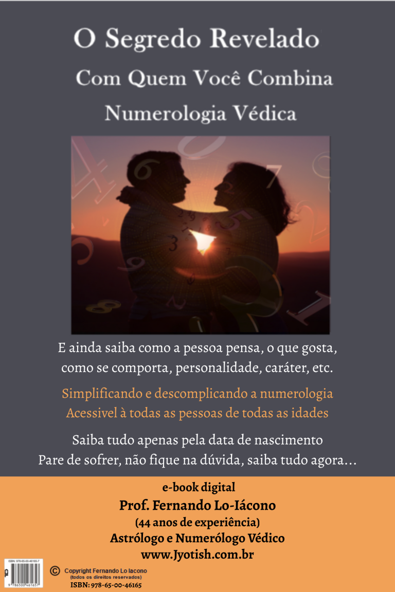 A pior coisa é a dúvida, a incerteza, se vai dar certo, se combinam, se encontrou sua alma gêmea ou não? Muitos relacionamentos fracassam porque as pessoas agem de forma impulsiva, apressada demais, se iludem, imaginado que a outra pessoa seria maravilhosa, lembrando que as aparências enganam, e muito, ainda mais nos dias de hoje, onde vivemos na era das fake news! Muito sofrimento, decepções, desilusões, frustrações, brigas, rupturas, separações, divórcios poderiam ser evitados se as pessoas procurassem saber melhor quem são e se realmente combinam de verdade para garantir um relacionamento saudável e duradouro, se possível para toda vida! E agora qualquer pessoa pode saber se combina com a outra pessoa usando este fantástico e-book de Numerologia que nos permite saber com quem combinamos apenas pelo dia e/ou data de nascimento das pessoas! Qualquer pessoa de qualquer idade pode se beneficiar muito com este e-book, pois basta que a pessoa saiba somar, só isto! Agora você pode saber como que cada pessoa pensa, sente, ama, se comporta, se relaciona com o seu dia de nascimento! Até mesmo para fazer uma nova sociedade comercial, empresarial, profissional, qualquer tipo de parceria!