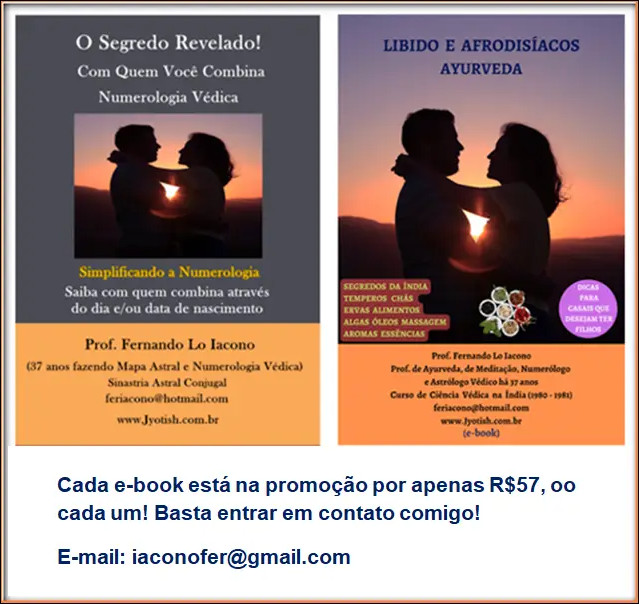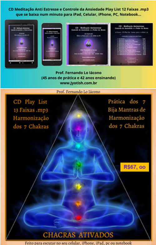 Lancei meus 2 e-books e meus 2 CD´s Playlist .mp3 de meditação, maravihosos, únicos e exclusivos, resultado de anos de convivio diário com os 4 médicos indianos (Vaydias), que estão à venda, bastando me enviar um E-mail ou mensagem!
