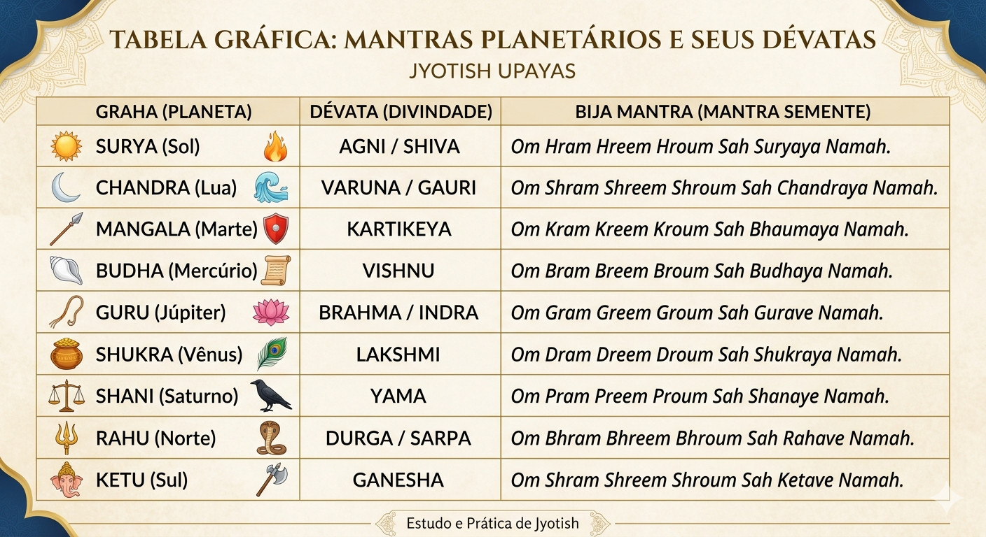 Ao entoar o mantra de um planeta, entramos em ressonância com seu Dévata (divindade regente), buscando mitigar desafios ou fortalecer qualidades positivas. É uma prática de geometria sonora que organiza o campo energético, trazendo clareza, harmonia, proteção e equilíbrio espiritual. Os Mantras devem ser repetidos 108 vezes ou seus múltiplos no dia e hora mais auspiciosos para que surtam seus efeitos positivos!