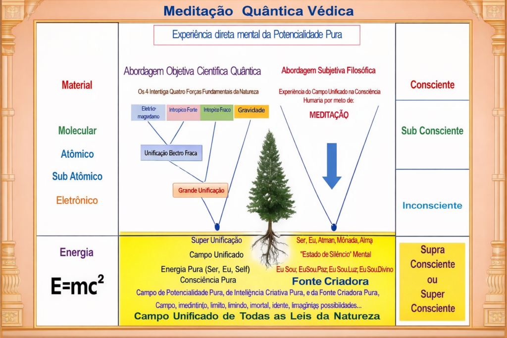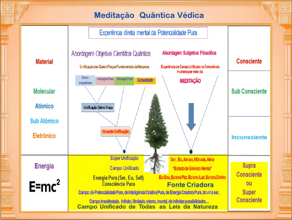 Através da prática da MEDITAÇÃO conseguimos acessar a FONTE CRIADORA em nós, no nosso Ser, Eu, Self, Atman, de forma simples, fácil, natural, sem esforço! Na Física Quântica a FONTE CRIADORA é chamada de Campo Unificado, uma campo de infinitas possibilidades, de pura potencialidade, criatividade, inteligência criadora, de energia pura, auto suficiente, auto referente, de pleno potencial, de equilibrio perfeito, de ordem, de coerência, de harmonia, de silêncio infinito, ilimitado, transcendental, de espiritualidade pura, imortal, eterno, de pura consciência, ou de consciência pura, de pura potencialidade, do vir a ser, um campo de correlação infinita, que nos conecta com a Fonte Criadora Divina, com a Consciência Divina, Cósmica, Universal! Neste nível somos todos um! E aí dizemos: Eu e o Pai somos um só! E nos sentimos unificados com o todo!