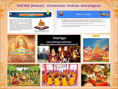 As YAGYAS (Yaguias) são cerimônias, rituais védicos muito antigos, milenares, realizados na Índia apenas, por equipes de Pandits Védicos especializados, que receberam este conhecimento maravilhoso dos seus pais, avos, bisavos, tataravos, etc., que seguem uma ritualística muito precisa, ordenada, com a finalidade de amenizar os efeitos de certos planetas maléficos e/ou kármicos do Mapa Astral das pessoas. Desde 1990 venho ajudando milhares de pessoas com a organização e planejamentos das Yagyas, sempre trabalhando em cooperação com a equipe de Pandits de Nova Délhi – Índia! Para cada tipo de problema tem uma Yagya especifica!