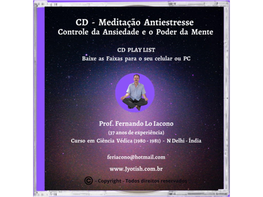 Aqui abaixo o meu CD Play List de Meditação Quântica Védica do Yoga tradicional da Índia para a redução do estresse, da ansiedade, prevenção das doenças psicossomáticas (insônia, hipertensão, gastrite, depressão, síndrome do pânico, medos, fobias, memória ruim, baixo poder de concentração, imunidade baixa, alergias, baixa auto estima ou auto confiança, etc.!